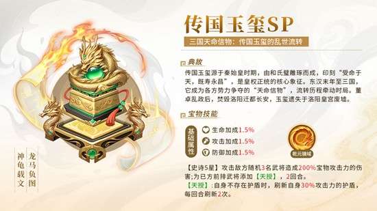 传国玉玺在三国大冒险中象征着至高权柄与天命归属,其原型可追溯至秦始皇以和氏璧所制的皇权信物。在游戏中,这件S+宝物同样具备强大的战场影响力。除了为武将提供全面的基础属性增益外,它还拥有名为“乾元镜域”的主动技能。该技能可对三名随机敌方武将造成200%宝物攻击力的范围伤害,并为己方前排单位施加护盾效果。护盾具备每回合刷新两次的特性,极大提升了前排的持续承伤能力,使其在面对高爆发敌人时更具韧性,是许多防守型阵容的核心选择。