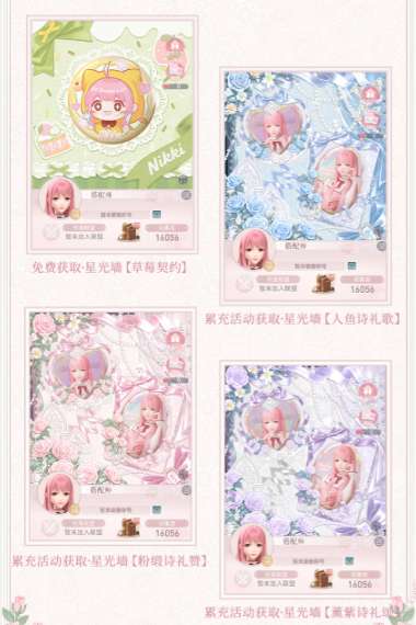更新之后登录游戏,系统会直接送一个叫"草莓契约"的星光墙给玩家。这个是免费的,不用花钱就能拿到。如果想要更多样式的话,可以参加累充活动。充值经验累计到2880的时候,能解锁三款不同风格的星光墙,分别是"粉缎诗礼赞""人鱼诗礼歌"还有"薰紫诗礼颂"。这几款星光墙的配色和图案,都不太一样,可以按自己喜欢的风格来选。