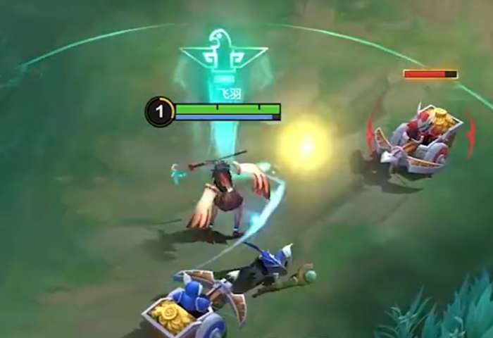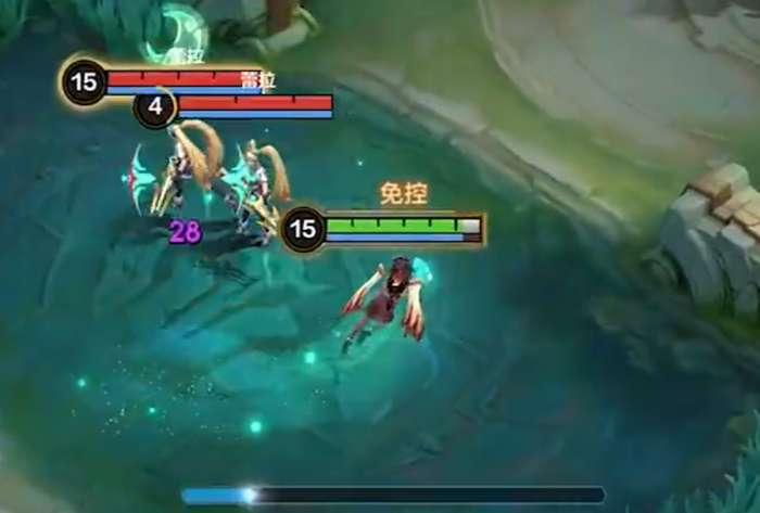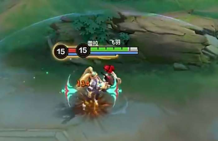 他的第二个技能会以自身为中心在范围形成领域,随后向着前方轻轻跳跃,落地后获得加速效果以及护盾,靠近领域的一名队友,也可以获得护盾,并且可通过点击的方式被牵引到飞羽的身边,获取到相同的加速效果。