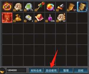 2、第二步,划重点!点开背包,打开自动使用,这时打怪所掉落的经验丹、龙币、元宝都会自动使用,解放双手,释放背包空间!