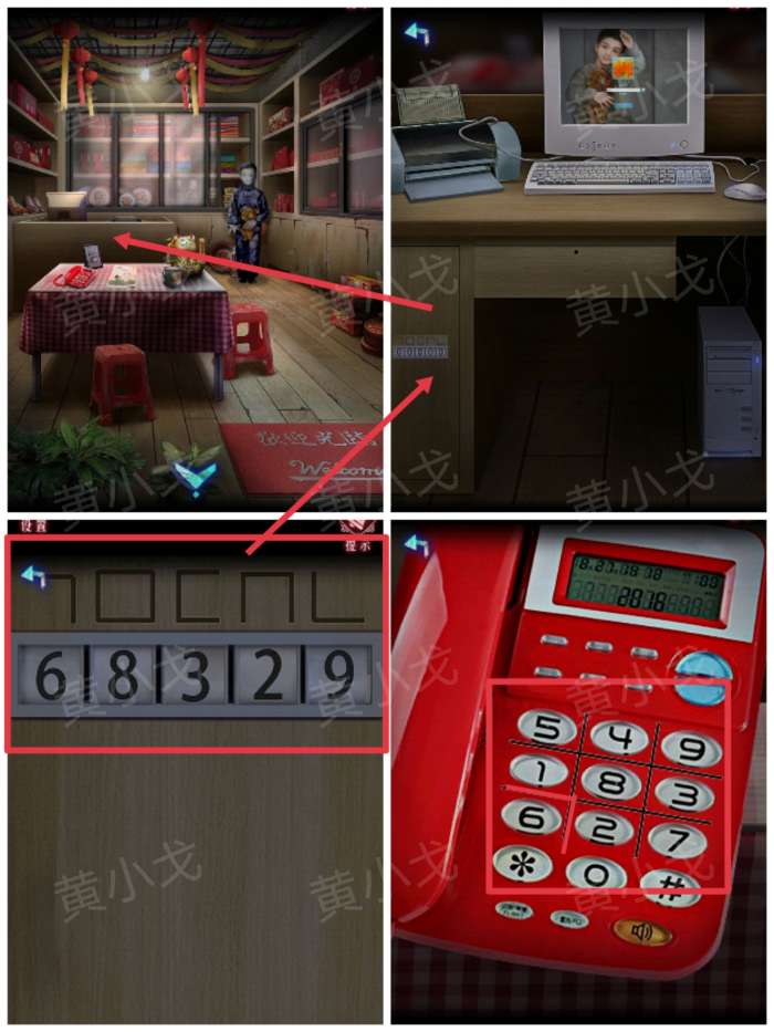 13.点击柜台柜子上的密码锁,根据上面的提示,结合电话键盘上的线索,输入密码:68329
