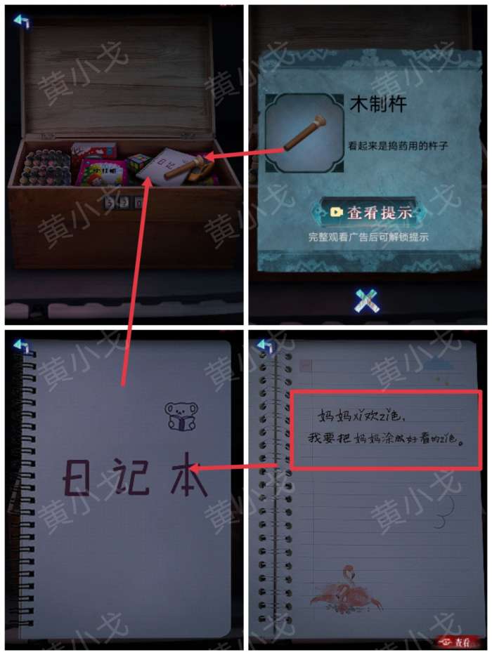 18.打开木箱,获得【木制杵】;查看日记本,获得线索