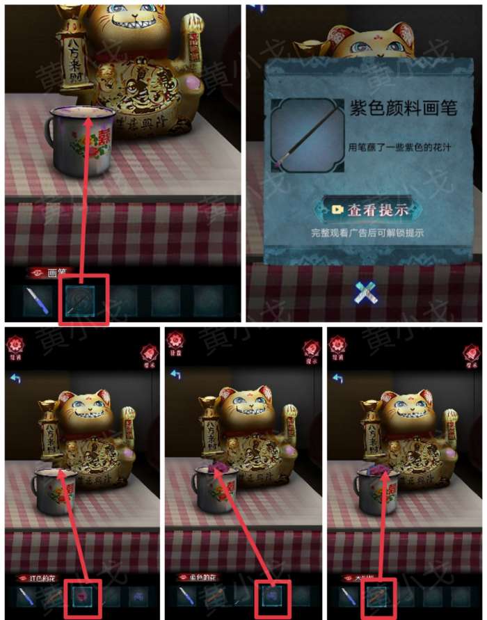 22.点击桌面上的画,根据日记本上的线索,用【紫色颜料画笔】给妈妈上色,获得线索