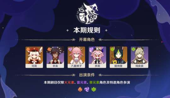 本月主题是火雷草,需要选择足够等级的角色进入待命库。在困难模式下需要选择16名等级至少70级的角色,卓越模式下需要选择22名等级至少70级的角色。6名开幕角色必须入库,如没有或未练可选择试用角色。除此之外,其他火雷草元素角色以及特邀角色也可选择进入待命库。
