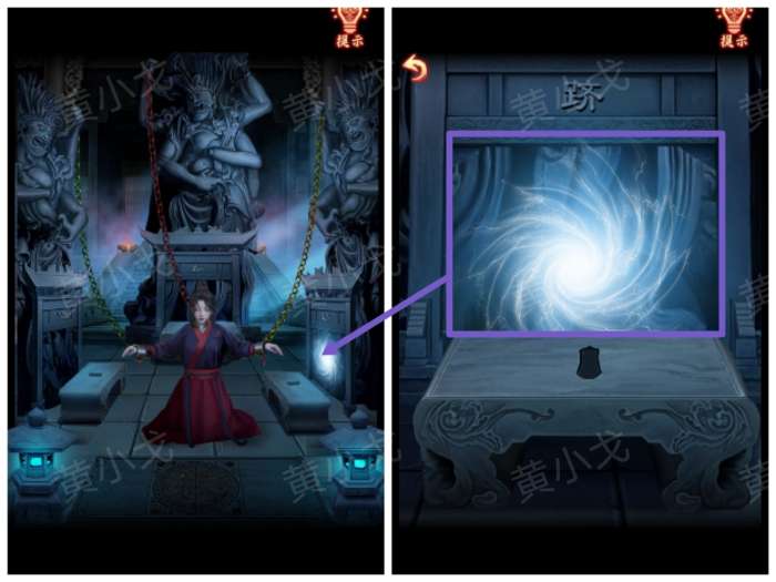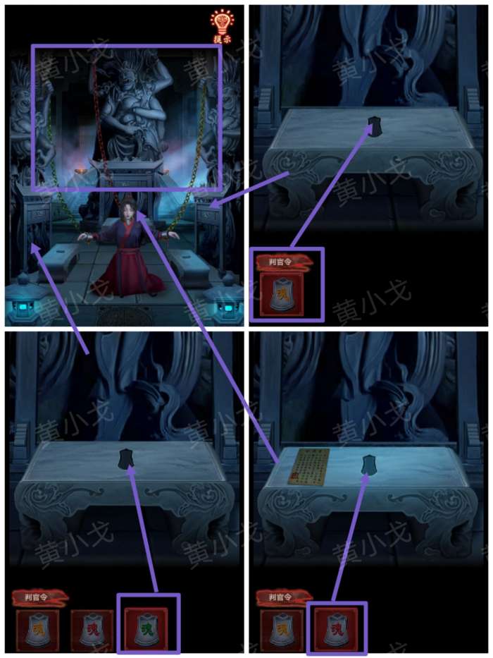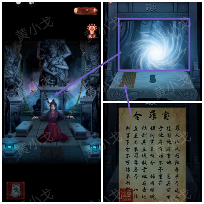 28.根据锁魂链的颜色,把对应颜色的【判官令】放入传送门前面桌子上的凹槽中,救出柳瑶