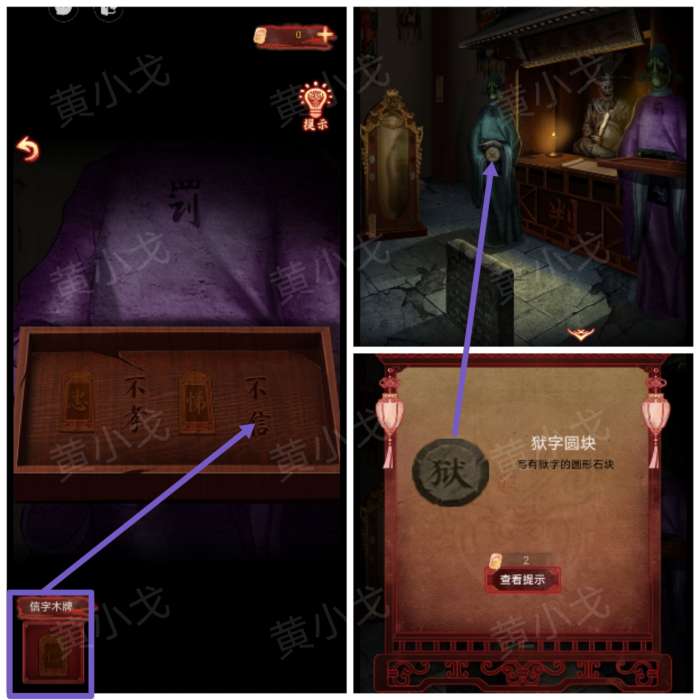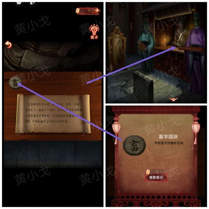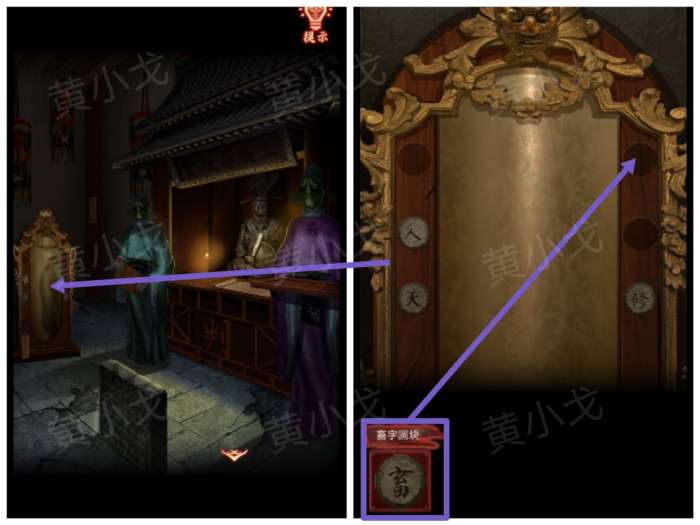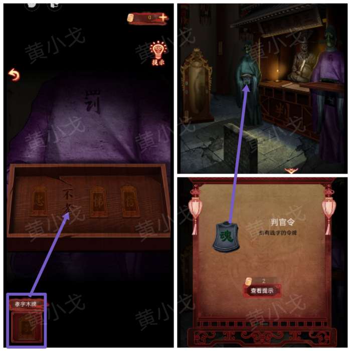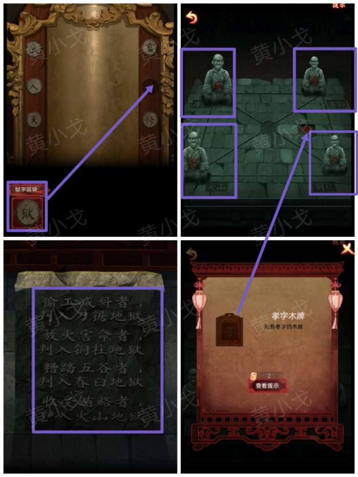 15.点击孽镜台,放入【狱字圆块】;点击镜面,根据殿前四个石像上的字和图案,结合石碑上的线索,调整石像的位置;打开暗格,获得【孝字木牌】