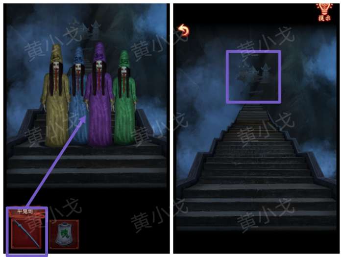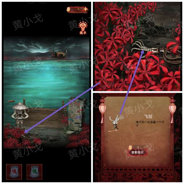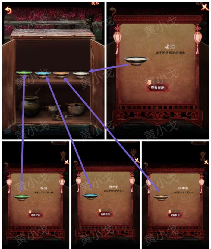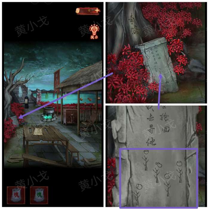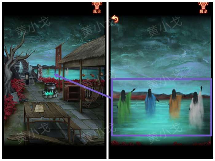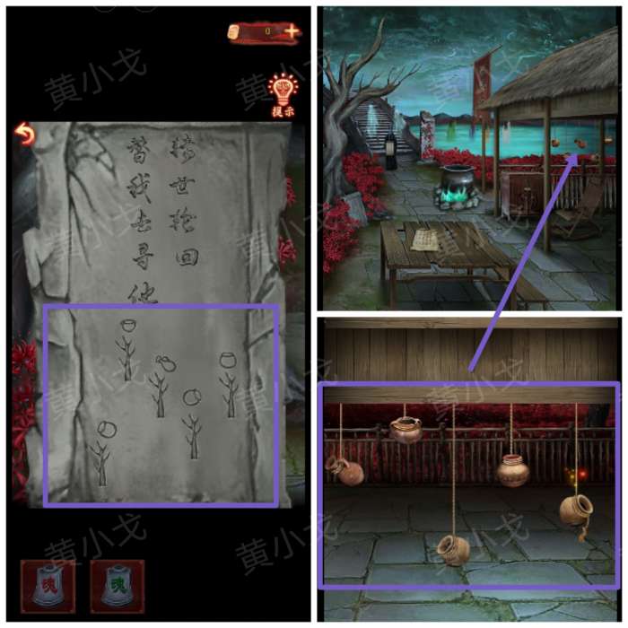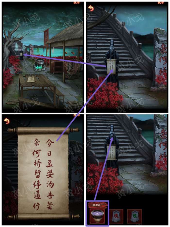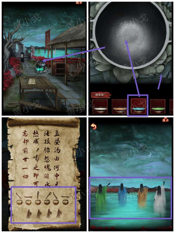 25.点击锅,根据卷轴上的线索和女鬼衣服的颜色及手朝向线索,结合四种泪的颜色,按顺序倒入四种泪,获得【孟婆汤】