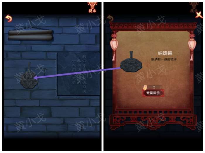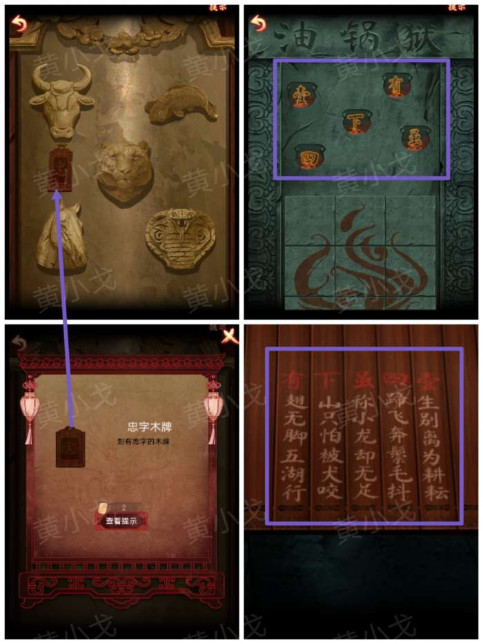 9.点击镜面,根据油锅狱石墙上的线索和竹简上的线索,调整兽首的位置;获得【忠字木牌】
