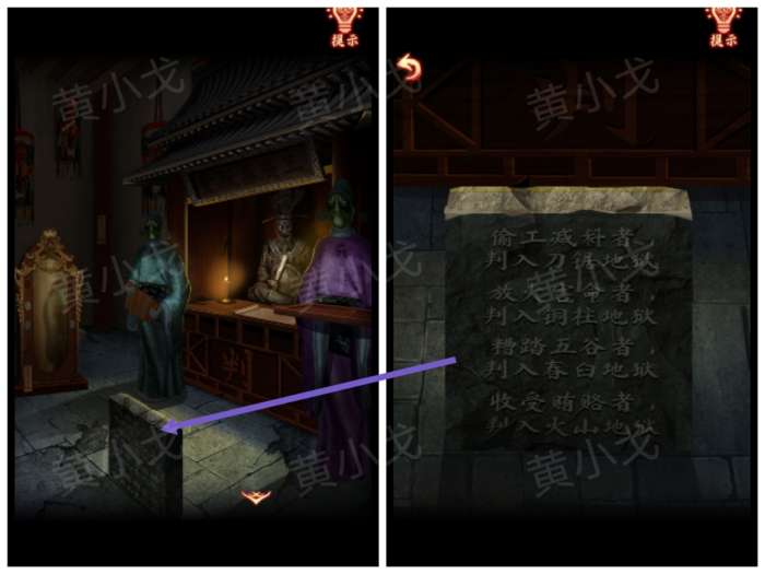 石碑上的线索:偷工减料者-入刀钜地狱、放火害命者-入铜柱地狱、糟蹋五谷者-入春臼地狱、收受贿赂者-入火山地狱