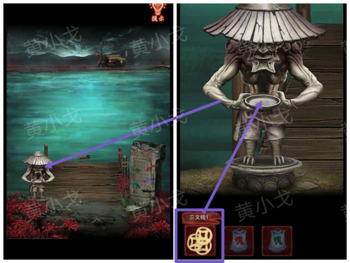 12.点击河中的木盒,用【飞挝】拉过来,获得【三文钱1】
