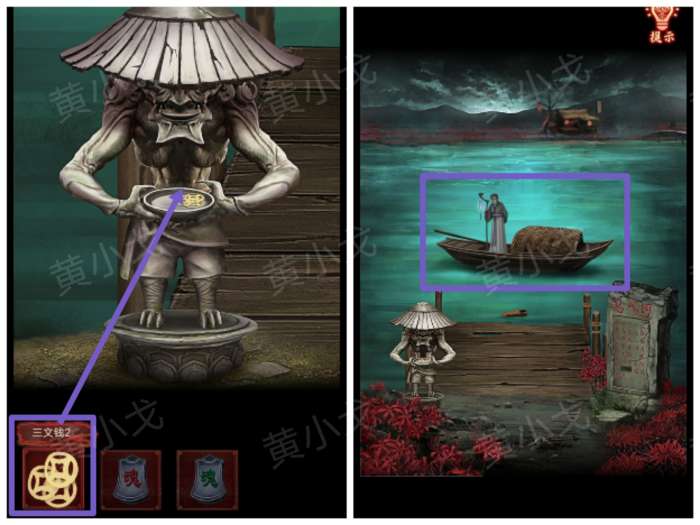 17.点击雕像,把【三文钱】放入碗中,飘来一艘船,点击上船,去到对岸