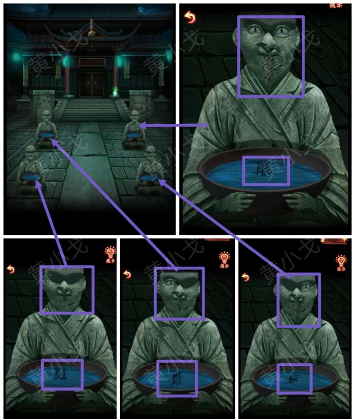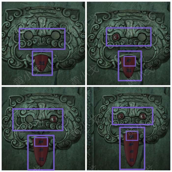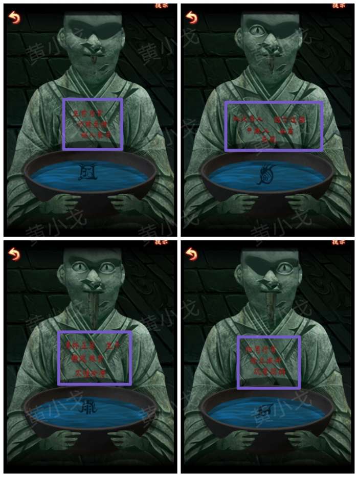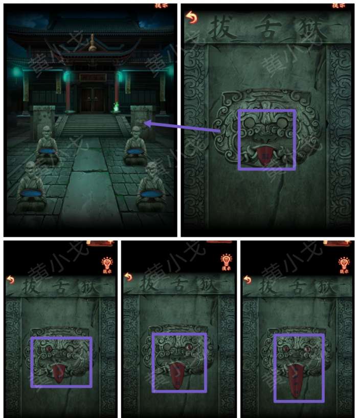 4.点击四个石像,根据他们的眼睛状态,结合拔舌狱石墙上的线索,调整他们的舌头长度和盆里的图案