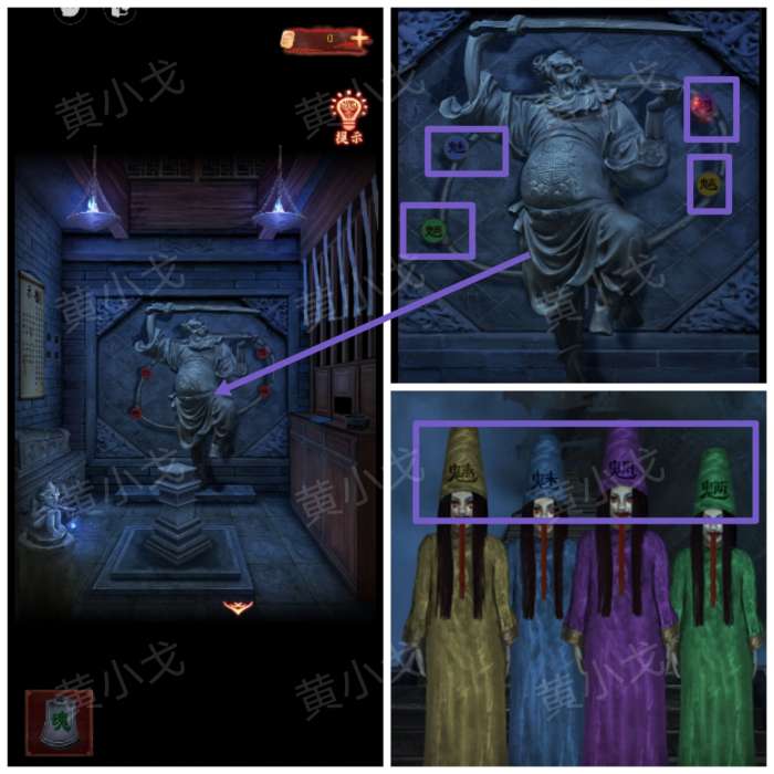 注意小鬼的帽子颜色及上面的字:黄-魑、蓝-魅、紫-魍、绿-魉