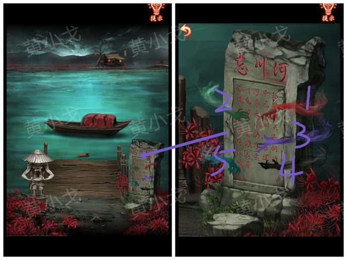 15.点击忘川河石碑,根据船的颜色和顺序,按的顺序点击鬼手
