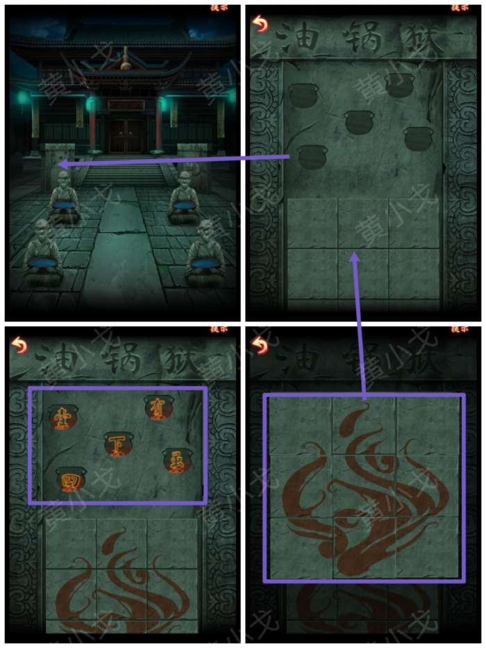 油锅狱石墙上的线索(字的位置):左上-壹、左下-四、中-下、右上-有、右下-虽