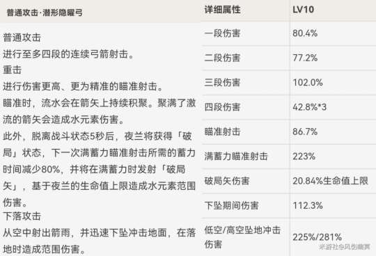 蓄力时间减少80%,并且射出的箭是根据夜兰生命值上限造成【水范围伤害】。