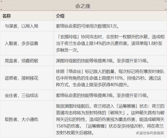 六命:开Q夜兰自己的普攻变成【伤害更高】的「破局失」,20秒内可射5发。(速切命座)