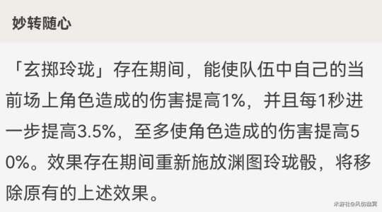夜兰的核心辅助功能,大招期间每消耗一秒都能提高自己场上角色造成的【所有伤害】,14秒达到最高值。