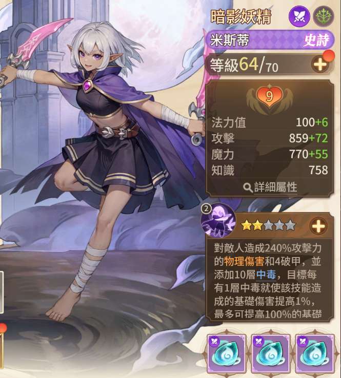 角色使用米丝蒂,主要依靠技能打出伤害。通过叠毒可以提高技能的基础伤害。