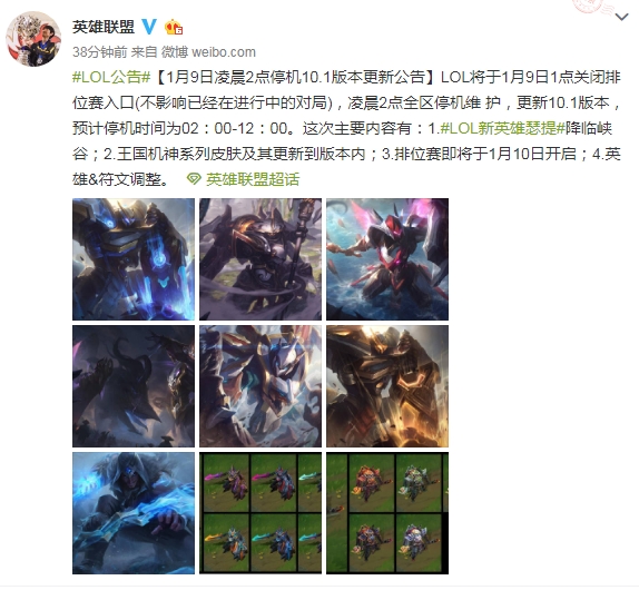 另据报道,《英雄联盟》也发布停机更新公告:LOL将于1月9日1点关闭排位赛入口(不影响已经在进行中的对局),凌晨2点全区停机维 护,更新10.1版本,预计停机时间为02:00-12:00。这次主要内容有:1.LOL新英雄瑟提降临峡谷;2.王国机神系列皮肤及其更新到版本内;3.排位赛即将于1月10日开启;4.英雄&符文调整。