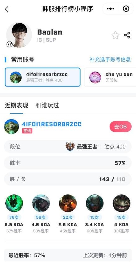宝蓝这是状态回暖了呀,从韩服排行榜小程序中查到,最近Baolan单排不仅冲上了韩服王者400点,胜率高达57%,这战绩已经很顶了吧?