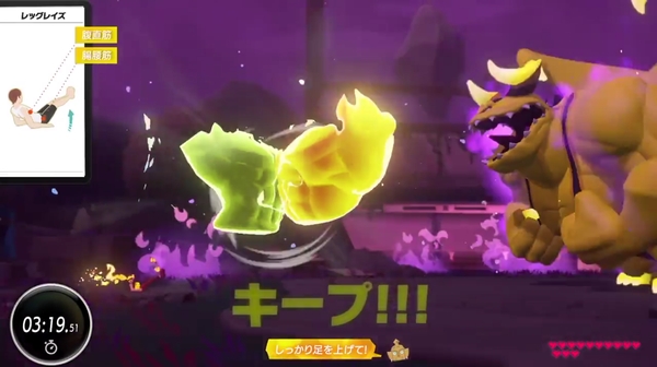 《健身环大冒险》为一款角色扮演游戏,邪恶的健身魔龙威胁着大地的安全,玩家扮演的主角需要“动起来”以拯救世界。除游戏本体外其将附带一只健身环与一个腿部固定带。游戏开始前玩家将Switch的手柄插进健身环,并将固定带绑在腿上,即可通过做出各种动作控制游戏角色的行动。