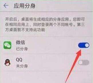 最后选择需要分身的应用,以微信为例,点击打开微信右侧的开关,显示已经分身即可。