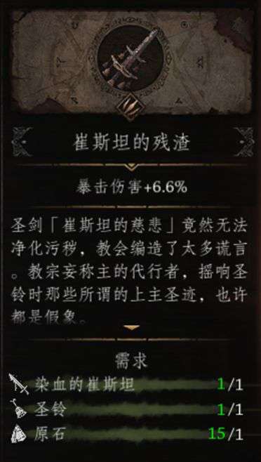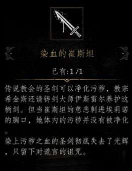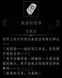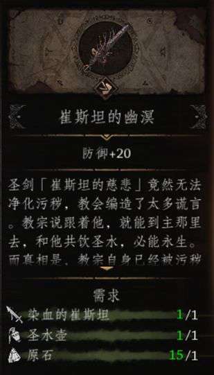 如果选择使用【崔斯特的慈悲】,会发现感染了污秽的修女并未被杀死,而转化为小怪,击杀后仍会掉落【染血的遗书】。背包中出现【染血的崔斯坦】。
