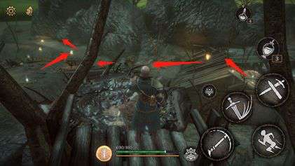 七、往下探索开启机关放另外一个囚牢下去,随后从堆叠空牢笼的洞口出发,不理会左侧的火猪。靠右侧走进入门洞。