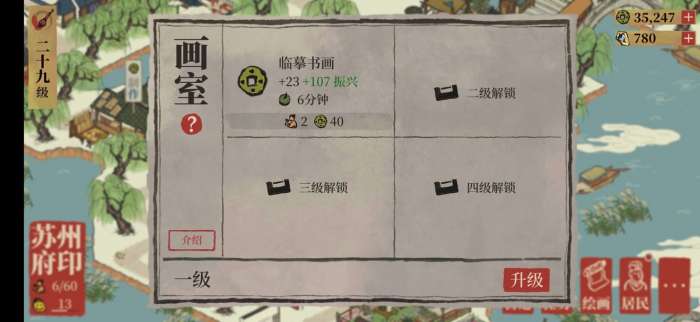 与寿材店一比,画室就显得比较普通了虽然少需要了一个人口但是赚的钱就少了不少,有的人会说时间不对等,我希望大家不要只站在自己的角度看,因为很多玩家是没有非常多的在线时间的,而产钱高,收取时间适中的寿材店就会成为最佳选择,疯狂的点点点也容易产生疲劳,这已经不是在享受游戏了,而是为了赚钱当作一个任务,这样其实并不好。(二十八级,其实八个满级渔具铺和八个满级药铺外加四个寿材店听说一个小时十五分钟能有两万多块钱,但是这是后期的效率加上高级人物,虽然我们不算后期但是一些基础还是能做到,这个时候已经不需要肝水井这样都低级操作了,而且应天府也能赚钱 还是建议大家细细的去玩其他的赚钱建筑,楼主从来就不刷水井,这些都可以问加过我好友的玩家,我从来没出现过大规模水井的时候,照样跟得上大家的进度!)