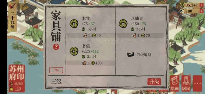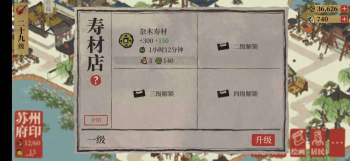 因为升级四级民宅需要两个家具铺,所以家具铺我们固定占两个位置先抛开不管,苏州有新的特殊建筑——寿材店,这是我迄今为止见到的唯一一个占地2×3格占地的赚钱建筑,但是他的赚钱能力不枉它如此之大的占地而且就在前天晚上直接打乱了我规划好的布局。