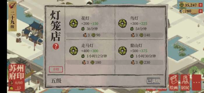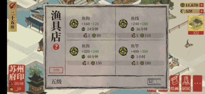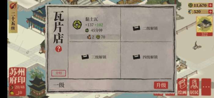 其实苏州的通贵狸和分水狸和应天府的财神有异曲同工之妙,越到后面的建筑生产的铜钱越多(瓷器店和瓦片店在苏州的初始生产额度很低,不建议在苏州建设),但是渔具铺是苏州的特殊建筑,相当于应天府财神地区的画室,所以通贵狸雕像渔具铺是占大部分的地区,但是因为丝绸店和灯笼店也属于苏州独有建筑,而且设计的非常好看,大家剩下的小部分地区可以留给这两个建筑,并且人口消耗不大,产钱也很可观,可根据自己的风景需求自行选择。