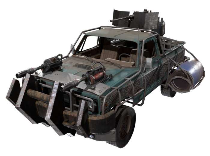 沙漠中的皮卡被小白裙开到海岛里面啦!而且还做了劲爆改装:车头安装车载喷火器、车身加装一对浮筒(部分没有)、车厢改造成M2车载机枪,乘坐人员降低为3人。