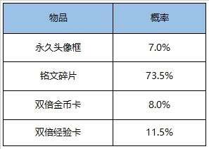 打开后可随机获得以下之一:韩小信头像框、牡丹仙鹤头像框、上分大吉头像框、萌小离头像框、双倍金币卡:1日、双倍经验卡:1日、铭文碎片*158/128/88/58。