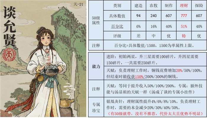 谈允贤,理财能手,无论是挂机刷钱,还是客申刷书局(与许宣相当),都比李清照差了那么一点点。顺带探险(不冲突,冒险体力303,无须额外佩戴探险类珍宝),制作也尚可。