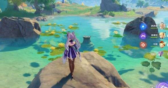 因为可莉弹弹炸弹会弹一定距离,所以在石头表面倾斜最低的那里放炸弹,这样炸弹往上弹就不会弹很远,停留到石头表面,这时候跑到石头最高处切换刻晴,