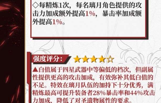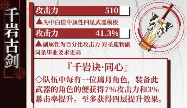 而对于加伤乘区较高,战斗中容易受击的角色如「雷泽」,「千岩」是更优的选择。此外「螭骨剑」作为纪行武器,精炼进度比较缓慢。