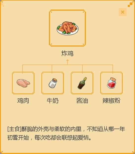 这个就是做炸鸡的主要材料了,只要找到了对应的食材就可以解锁对应的食谱了,一般人总是缺少一些的,如果找齐了就可以解锁了。