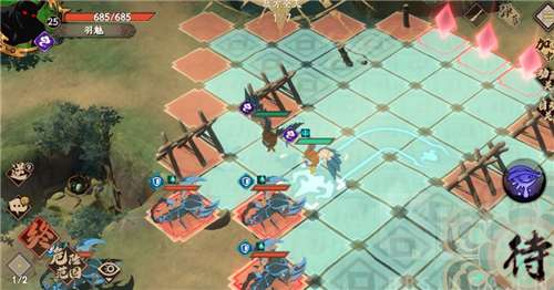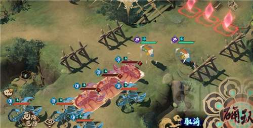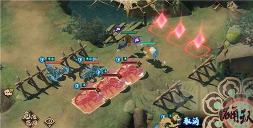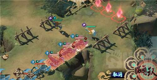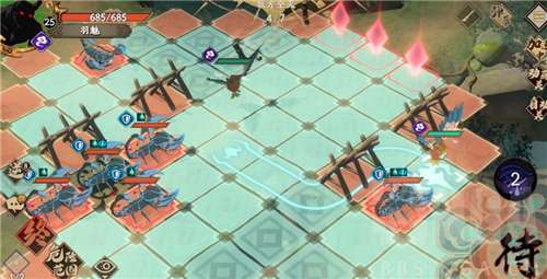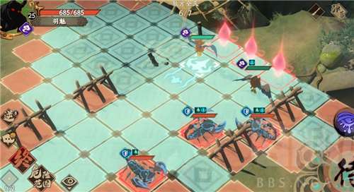 第三回合:上回合之所以把左路卡住让蝎子都走中路也是因为左路拒马的存在,如果这回合另一只羽魅不交技能的话就会跟不上技能CD了,所以把剩下的蝎子卡向中路,让后面的蝎子再多走一格冤枉路,本回合技能CD中的羽魅原地不动,另一只交技能顺便把中路卡死,如图