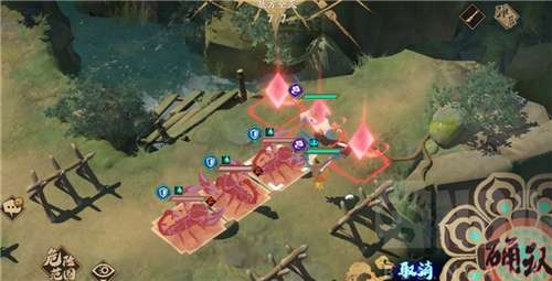第二回合:如果大家按照第一回合的思路聚怪之后会发现一条直线上轻易的就聚到了6只蝎子,然而我通过后面的实践发现,如果这里贪图一时爽快而直接技能全交然后不注意堵截的话会导致后面无论如何回溯也都是会有一只蝎子没办法处理掉,所以我们先交其中一只羽魅的技能杀掉最前面的三只,另一只继续卡位,如图
