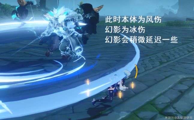 当玩家接近时,直接后侧步位移到场地另一头,并在原地留下冰幻影,两个魔偶一起蓄力圆斩。当玩家距离过远时,横向分身出一个风幻影,随后对你进行远程的风刃打击,只要距离够远的情况下无需冲刺横向走就可躲开。