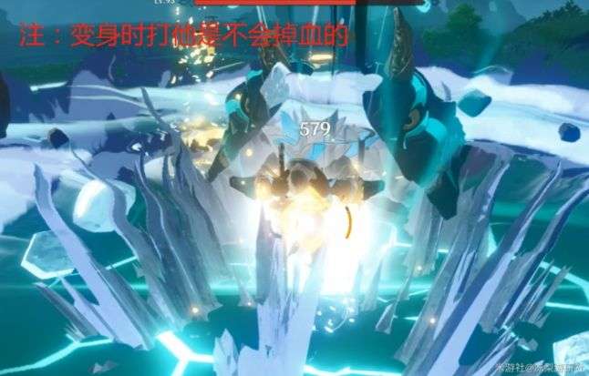 召唤双刀分别冰风附魔,经过较长的蓄力后戳向地面,造成较大范围的伤害。期间是锁血状态,虽然会跳伤害,但血量并不会减少。走到圈外看他无能狂怒即可。