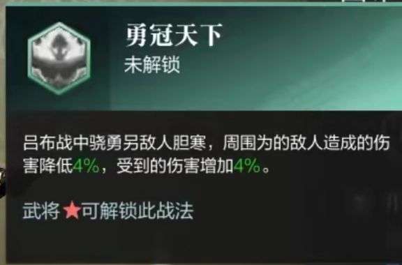 吕布战中骁勇另敌人胆寒,周围为的敌人造成的伤害降低4%,受到的伤害增加4%。