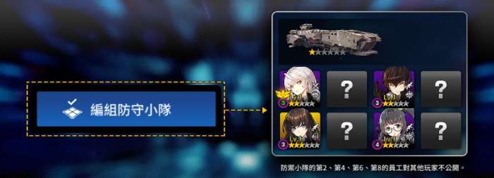 『战略对抗战』为自动进行战斗,须要设定防御小队,透过此队伍抵御其他老板们的进攻,并会依照组队队伍的顺序进行出击。