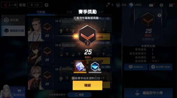 联赛期间将会于每周日晚间10点进行周结算,而赛季结束后进行总结算。结算后胜点将会依照赛季规则有所变动,后续也将会根据胜点重新安排对阵。