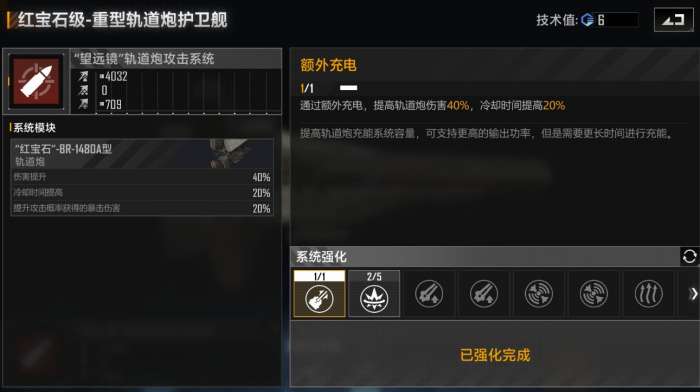 2、技术值优先投入到轨道炮攻击系统上,点出“额外充电”与策略“优势输出”上,其次点出暴击伤害与冷却缩减。
