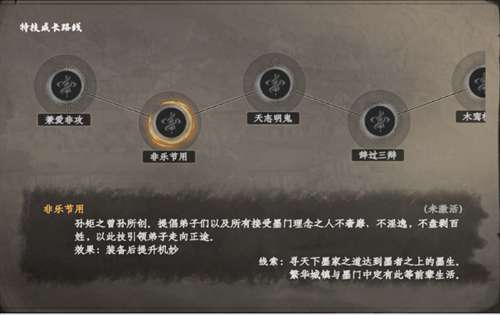 墨学的特技体系颇具特色。“兼爱非攻”让玩家在战斗中减少轻功消耗,维持更持久的机动性;“非乐节用”强调约束与效率,让角色在资源使用上表现得更为精细;“天志明鬼”则增强对局势的洞察力,为探索和任务交互提供额外助力;“辞过三辩”展现了墨家思想在言辞与逻辑上的优势,使角色在对话中更占上风;“木鸾机石”更像是机关术的化身,其作用虽不张扬,却能在暗处决定关键局势。这些特技的组合使墨学不仅限于数值优化,而是渗透到探索、战斗和交流的多维度体验中。