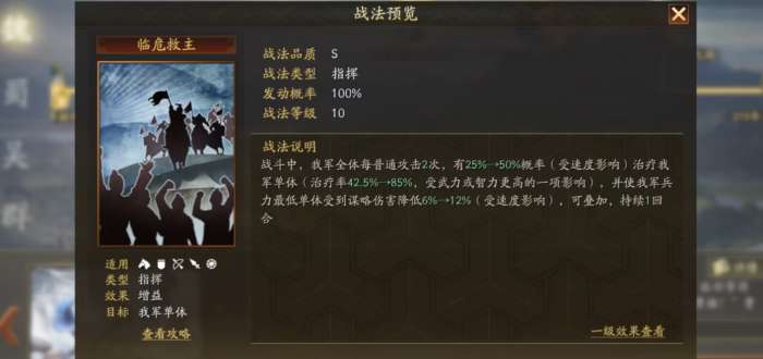 让其在造成兵刃伤的时候,治疗队里兵力最低的单体。“临危救主”则可在每平A两次之时,有一定几率治疗己方单体。并锁定兵力最低的友军,让其吃到的谋略伤降低。这两者的争议性也很大,最大的区别在于临危能在前两回合奇效。且疗效和武将的武力高低相关,还能减免法伤。因此它很适合应对法攻队,但不足之处在于奶量无法定向给出。非攻则得等到回合3才能起效,疗效和造成的伤害相关。若是被虚弱控制了打不出伤害,那非攻的奶量也就没有了。整体来讲临危强度会比非攻稍高一些,更适合白板党。