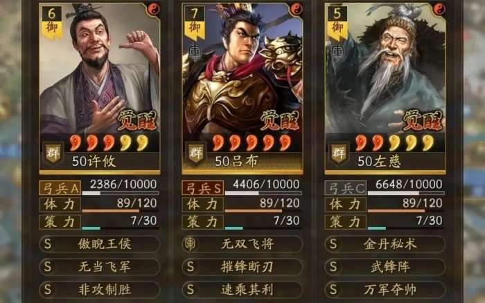 “先登死士” 可让己方全体免疫遇袭负面,受击时有概率触发2种增益。1种能在兵力百分比低于敌人的时候引发,并偷取对面的统率。2能在高于对面的时候触发,降低敌人一定的主动战法发动率。也就是说它能削减敌方统率和发动率,可用在满红的温侯弓里面。“白马义从”能提升友方行军速率,并在前两回合得到先攻。同时提升我方一定的主动战法发动率,此兵种的实用性不如前三种。如果一定要带白马义从,那吕布的兵书得改成胜战、执锐、一鼓作气。