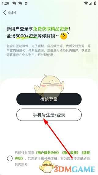 4、选择手机号登录时,输入手机号和验证码,勾选同意相关协议后点击登录,未注册手机号验证后将自动创建账号,开启幼教资源使用之旅。